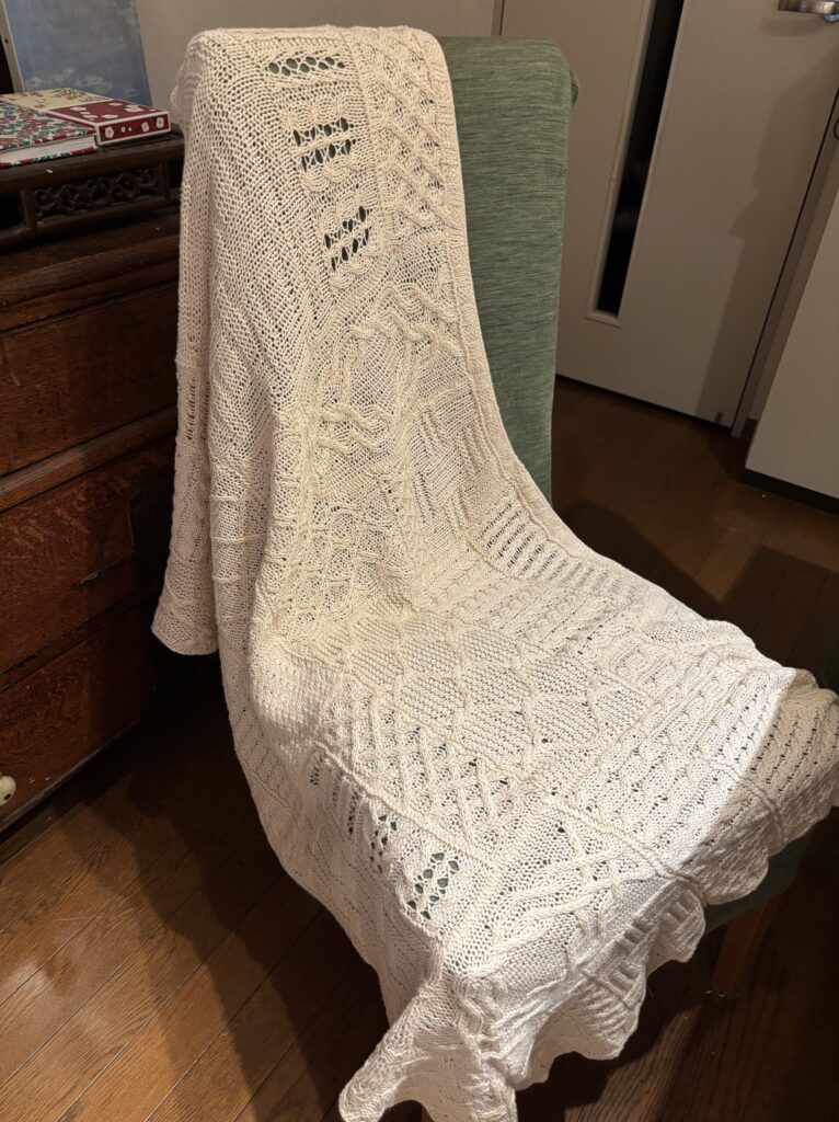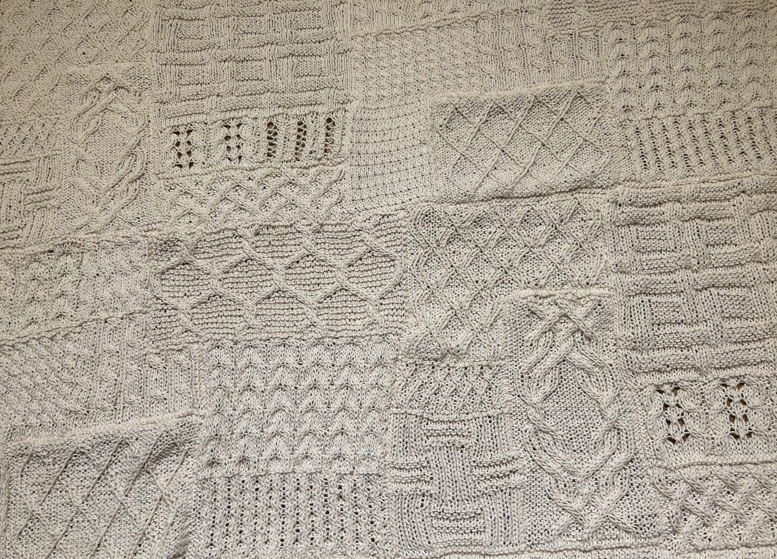 - My works1.アランブランケット vol.1パッチワーク風アラン編みブランケット 10数種類のアラン編みをパッチワーク風に配置させたブランケット