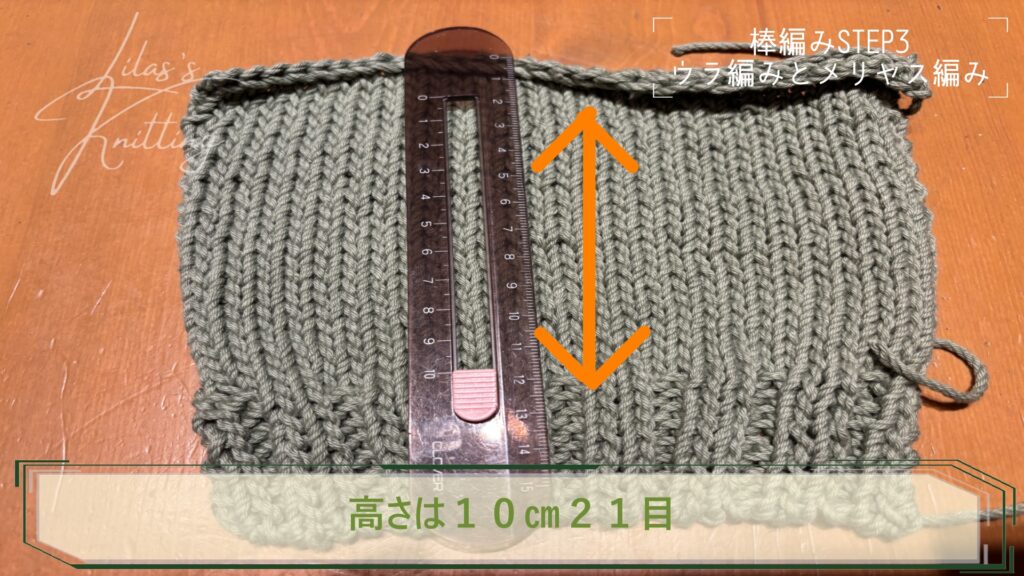 必要な高さ(段)まで表編みとウラ編みを続けます